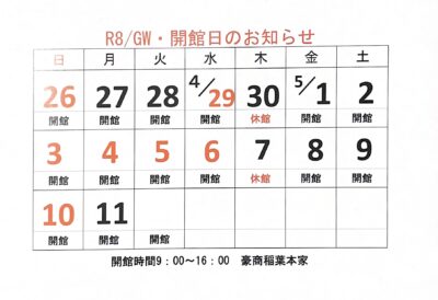 GW開館日のお知らせ GW期間中4/29(水)・5/6(水)は通常営業となります。 なお4/30(木)・5/7(木)は休館日となります。 また期間中のお電話による喫茶・お食事のご予約はお受けできません。(4/29~5/6) ぼた餅のお持ち帰りは前日までの予約にて承ります。 皆様には、ご不便お掛け致しますが、スタッフ一同来館をお待ちしております。 次ページ